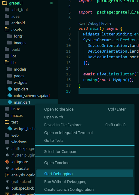 file (grateful/lib/main.dart) and click the "play" button on the top-right of