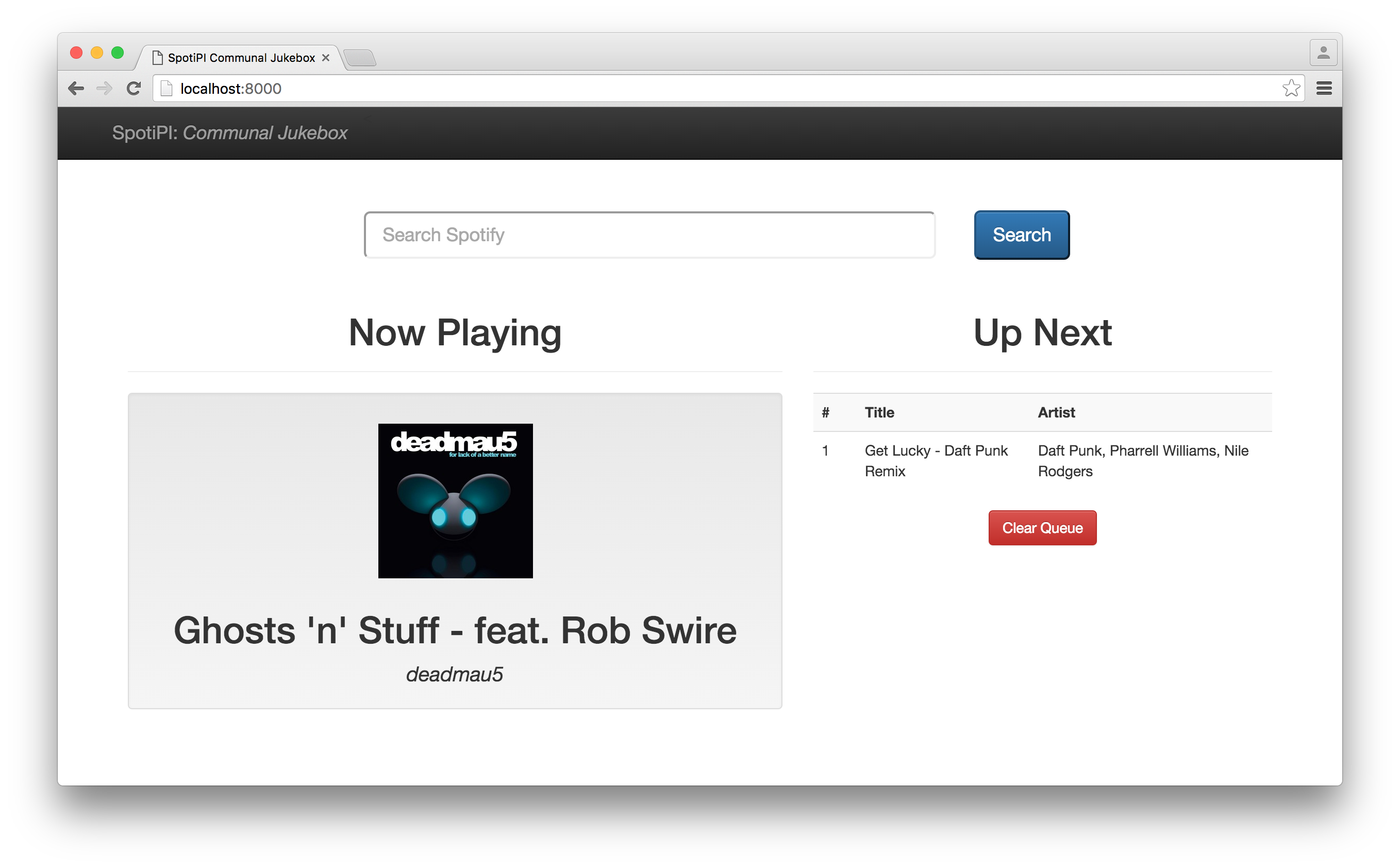 While the SpotiPI server is running, it by default listens for connections on port 8000. To view the web interface, open a web browser and navigate to the server running SpotiPI on port 8000.