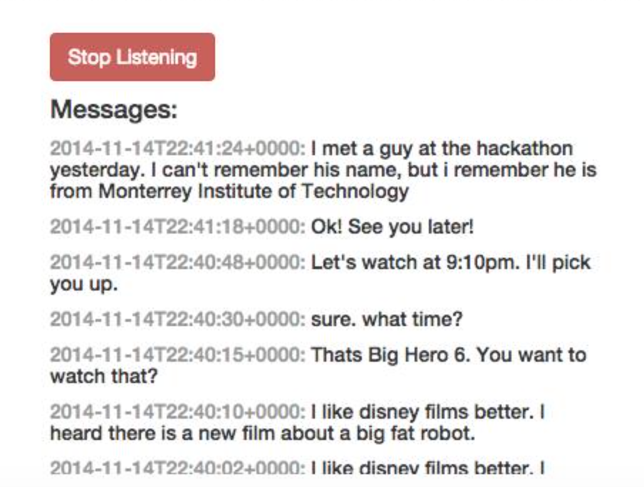 chat-consumer A Facebook Messeges chat consumer that sends notifications to a REST URL when a message thread is updated. One of 3 parts of our Global Facebook Hackathon Finals product, telepathy (https://github.com/abhilashmurthy/telepathy). Preview: