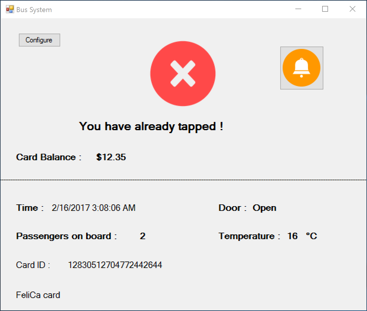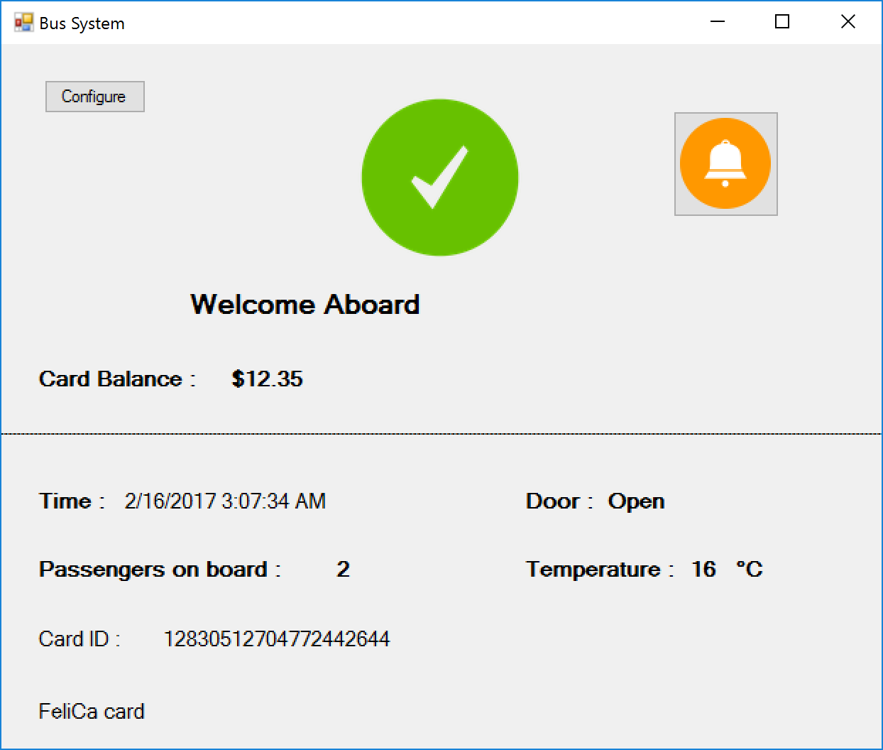 For this project, a project board which had a PIC18F4550 MCU, LEDs, Switches, UM232R and a RS-485 Transceiver was given along with a Autostar Wiegand Card Reader. I was tasked to design an executable which will be able to read the cards from the reader and also execute commands to the project board. This is to simulate a system which can be implemented in public buses to aid in the passenger count, card value deduction and assisting the bus captain.