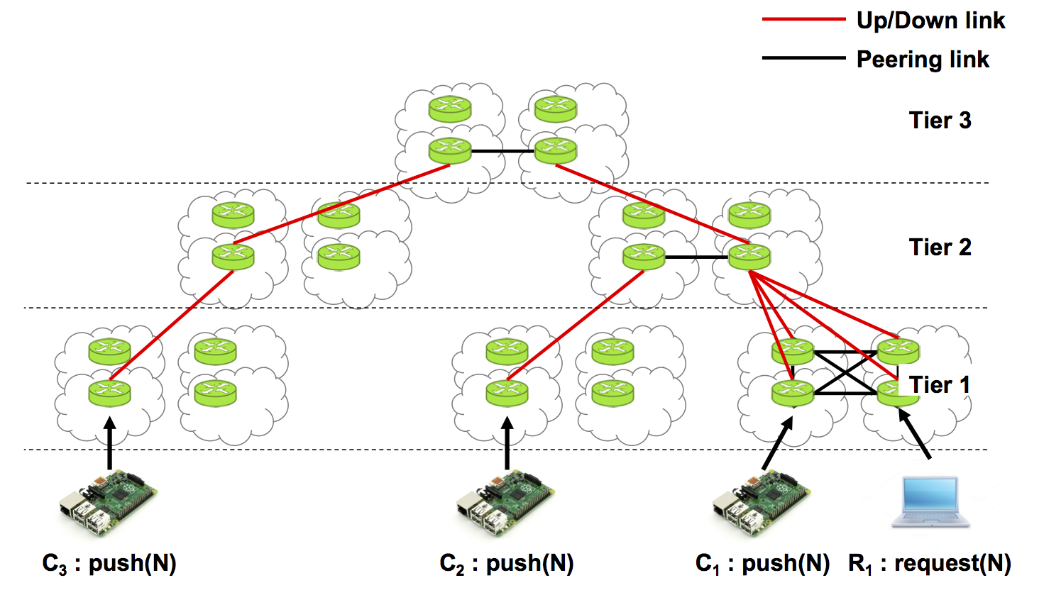 The network is hierarchically organized in tiers. Endpoints (e.g. R1 and C1,2 or 3) connect to the network via the lowest tier (t1 or 'tier 1'). The request is first looked up in a router @t1. If no positive matches happen (either false or true), the request is sent up to tier 2 and so on.