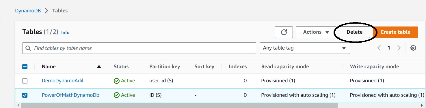 To delete the table, from DynamoDB console, select the table "PowerOfMathDynamoDb", and click "Delete table"
