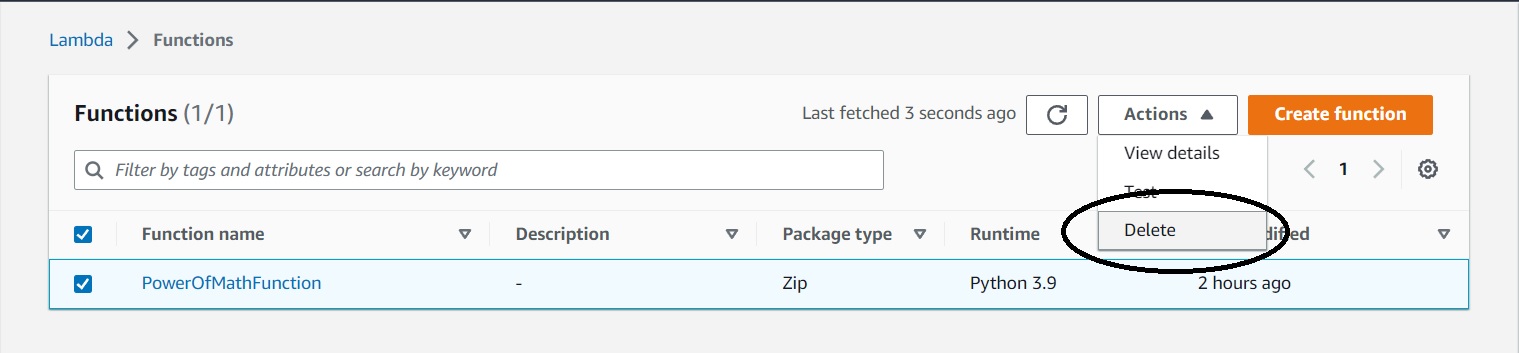 To delete the Lambda, from the Lambda console, select lambda "PowerOfMathFunction", click "Actions", then click Delete