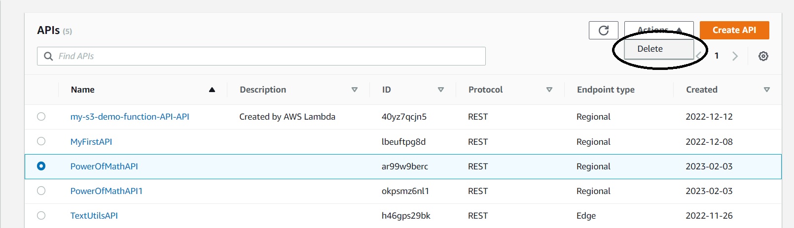To delete the API we created, in API gateway console, under APIs, select " PowerOfMathAPI" API, click "Actions", then "Delete"