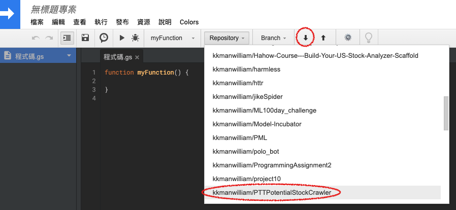 - 找到上方操作欄位中「選取函式」(在剛剛時鐘旁邊),並且選擇主要的 Function - pttPotentialStockParser,並且按下「▶︎」圖示就會開始跑了