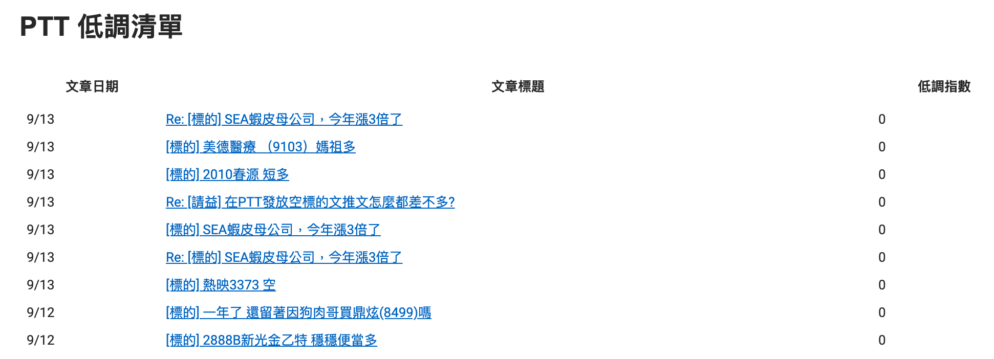 這是一個會每天自動幫你查看 PTT 股票版,並且從各種文章留言中,找出被大量網友推薦的「低調優質股」的工具。他會檢查每一天的股版標的文中,是否有鄉民留言「低調」,並計算這隻股票到底有多少人「低調相挺」,再每天寄信到你的信箱,以防你錯過這些低調的訊息。
