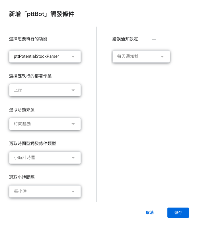 - 在選擇要執行的功能中,選擇主要的 Function - pttPotentialStockParser,並且設定時間驅動 > 日計時器 > 你想寄信的時間