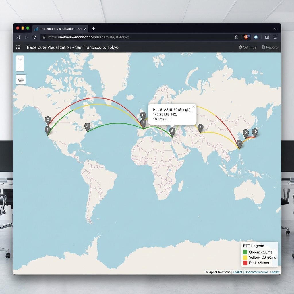 # Auto-generates: trace.json + trace.html# Monitor route every 30 seconds (like MTR)