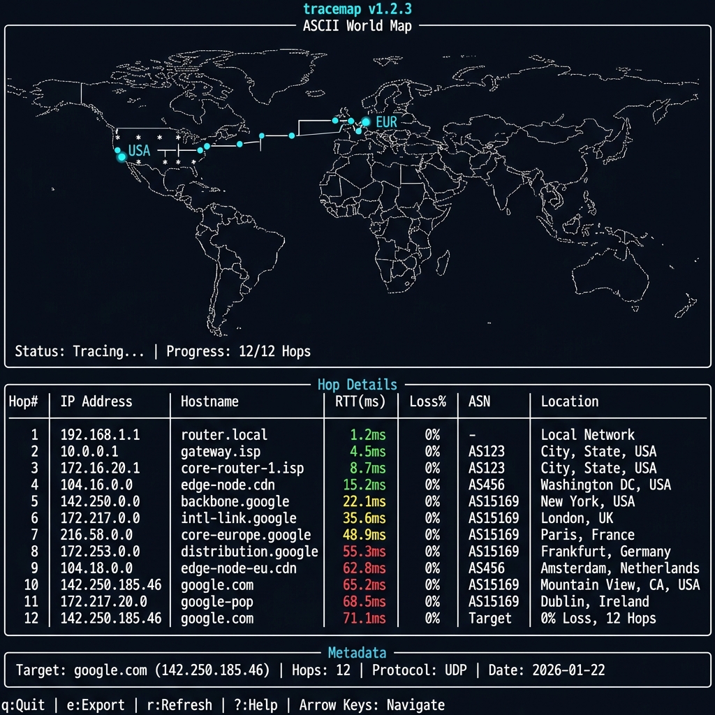 A modern traceroute visualizer for the terminal: TUI + interactive HTML maps + ASN/GeoIP lookups.