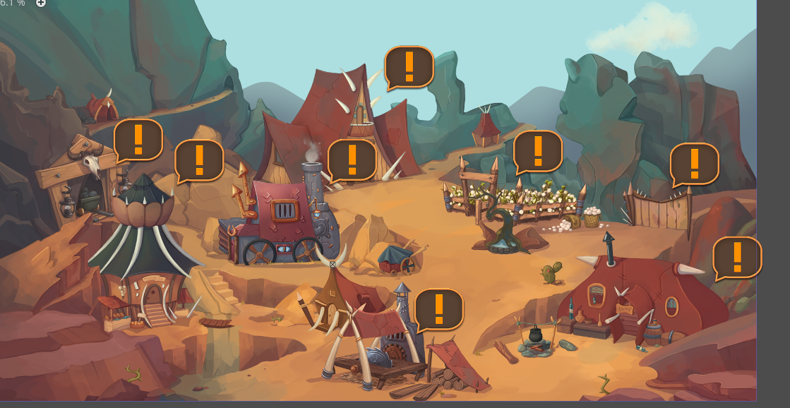 Text labels over active buildings (plus label design) to highlight what can be activated. Probably also for large map
