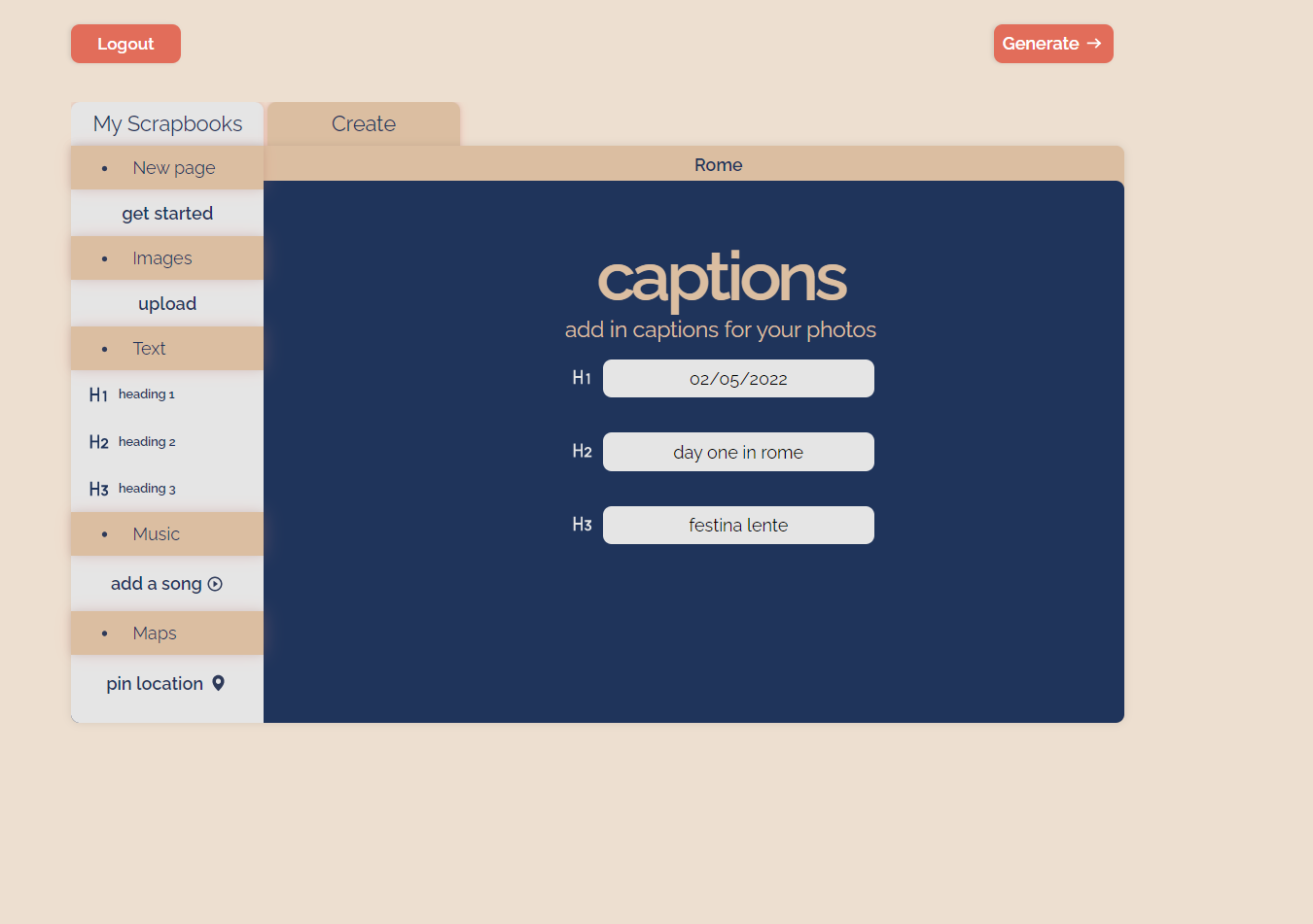 A virtual multi-media scrapbook generator for treasured memories. Add images, songs, maps and more!