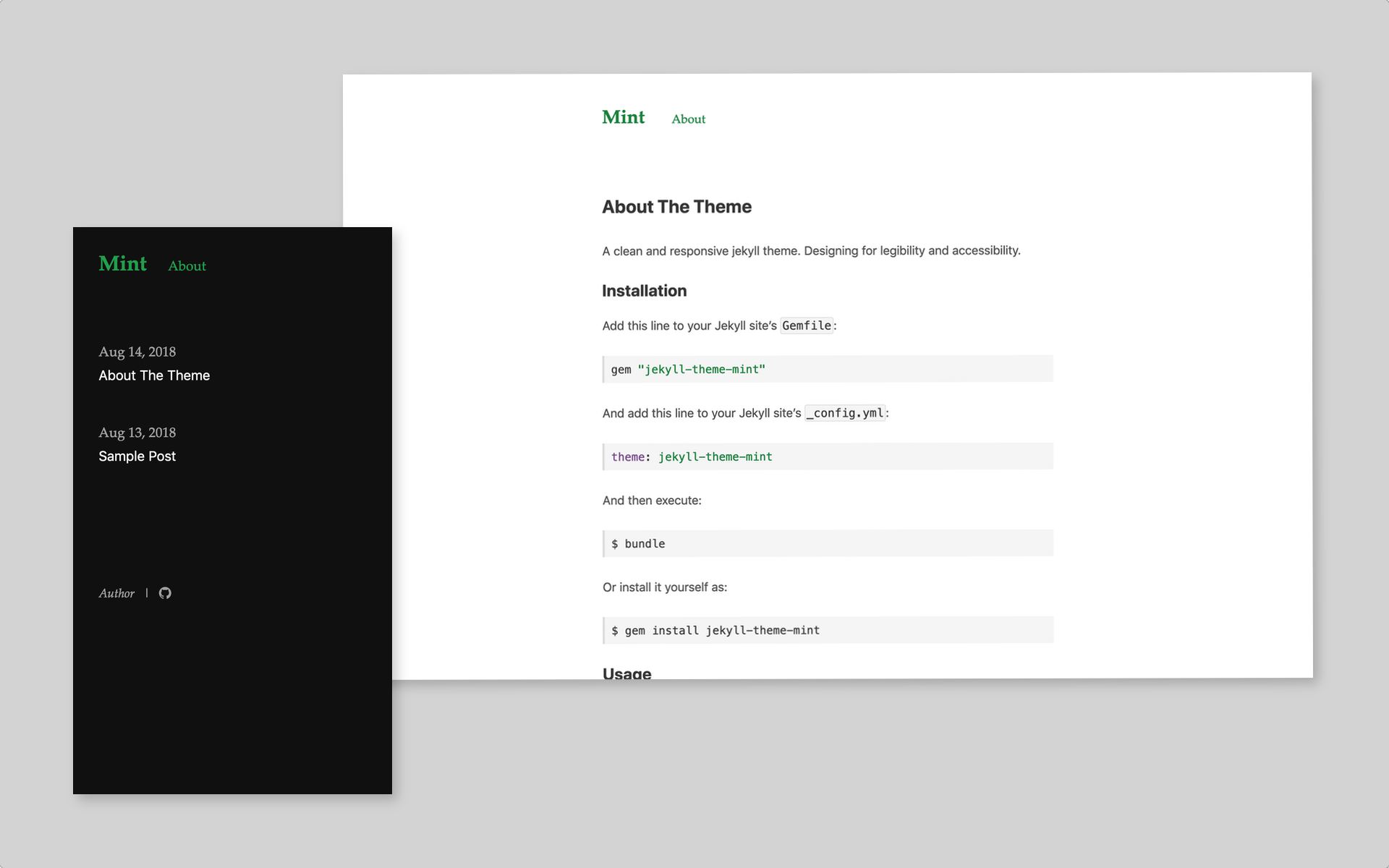gem "jekyll-theme-mint"And add this line to your Jekyll site's _config.yml: