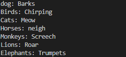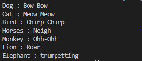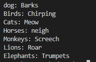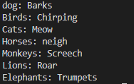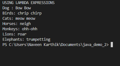 dogs,birds,cats,horses,monkeys,lions, andelephants.Implement the interface using lambda expressions to return the noise made by
