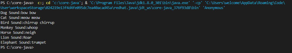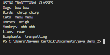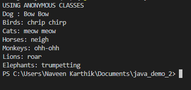 Bhavana // Traditional classes for each animal class Bird implements Animal { class Cat implements Animal { class Horse implements Animal { class Monkey implements Animal { class Lion implements Animal { class Elephant implements Animal { public class AnimalSoundsAnonymous { } } |