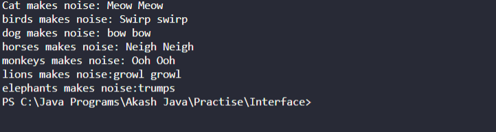dogs,birds,cats,horses,monkeys,lions, andelephants.Implement the interface using anonymous classes to return the noise made by