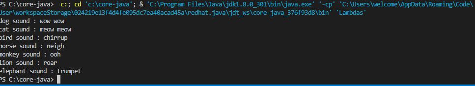 System.out.println("Bird Sound (using Lambda): " + animalBirdsL.makeSound());