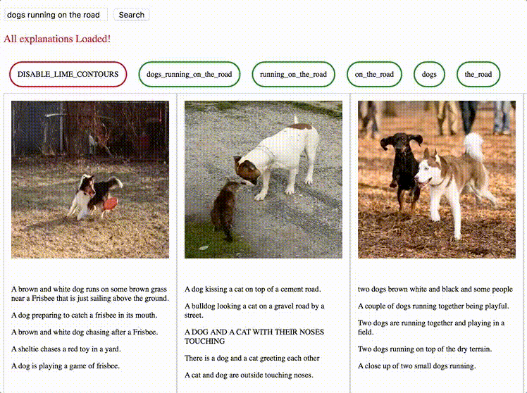 NOTE: Calculating LIME results for each (query, images) tuple requires ~3 hours as each phrase has to be run against every image retrieved. Hence, in the interest of time (and the limitations of having 1/0 GPUs) we pre-cache the LIME results for some sample queries. These sample queries can be accessed via clicking on the drop-down menu which appears when the user clicks on the search box. While LIME results are available only for a limited set of queries, the search and retrieval sans lime works for all queries, provided the input tokes are present in our dictionary.