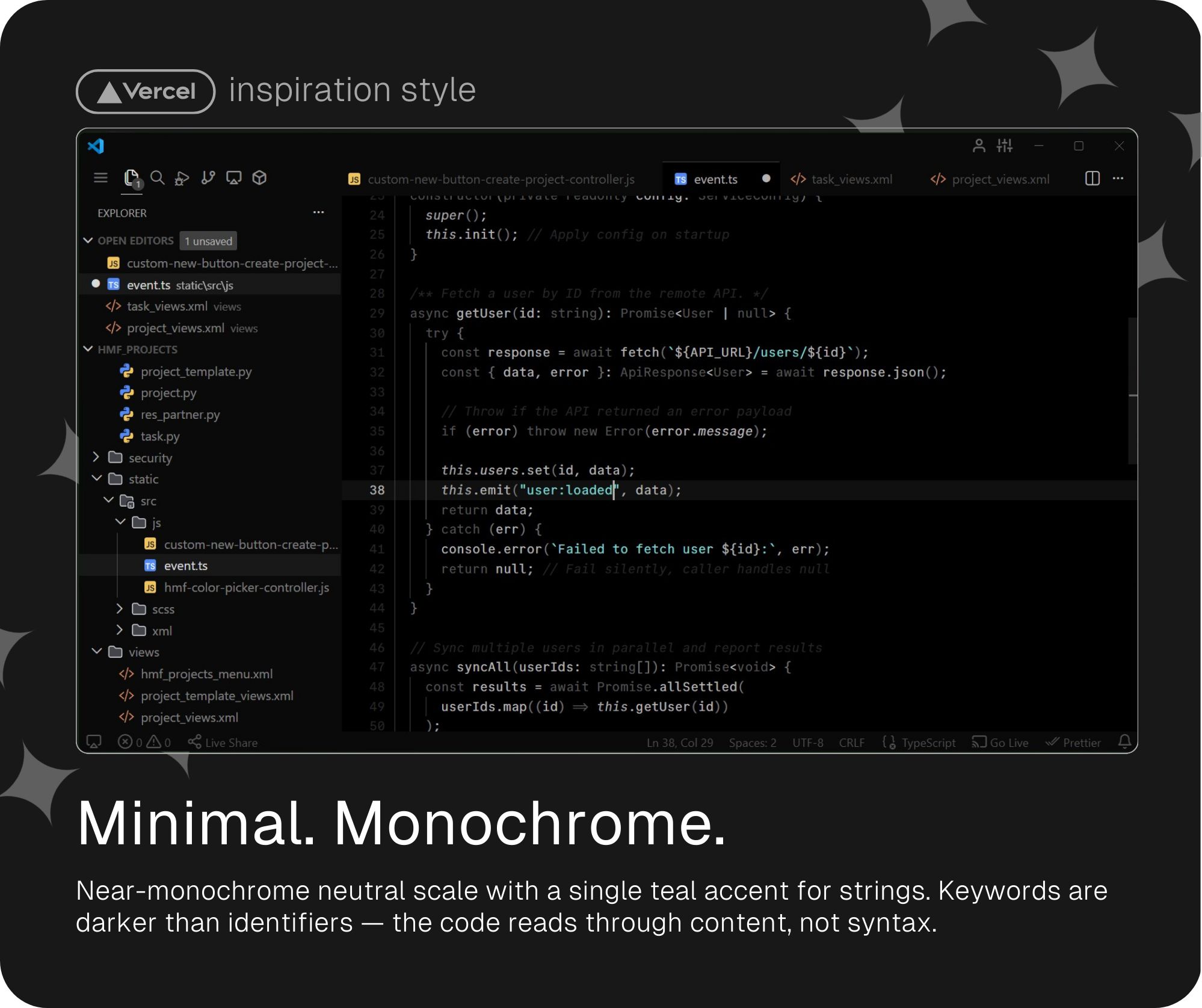 And finally, my personal favorite: a monochrome and super minimalistic variant in the spirit of Vercel's aesthetic — near-zero color, inverted hierarchy, with a single elegant teal accent reserved for strings.
