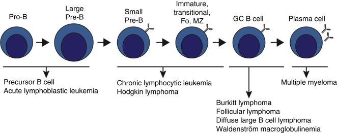 Before being capable of producing Ag-specific IGS, B cells must undergo a number of transformations, first in the BM and subsequently in the lymph nodes (LNs). The first stages of B-cell development occur in the BM, where pro-B cells first rearrange the Ig H chain gene to become pre-B cells. Pre-B cells continue this somatic recombination process by rearranging the L chain to become immature B cells, expressing IgM on their surface.