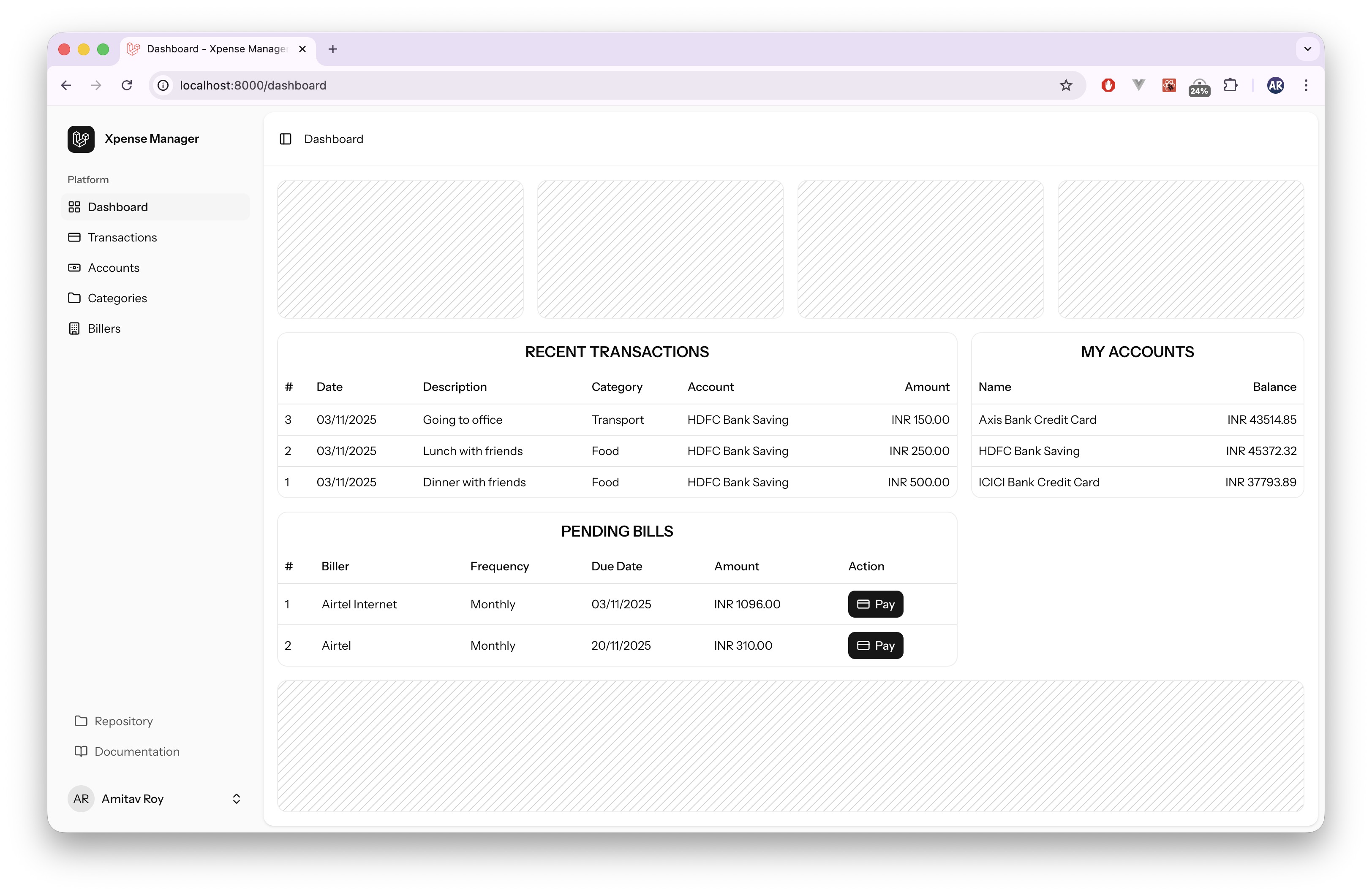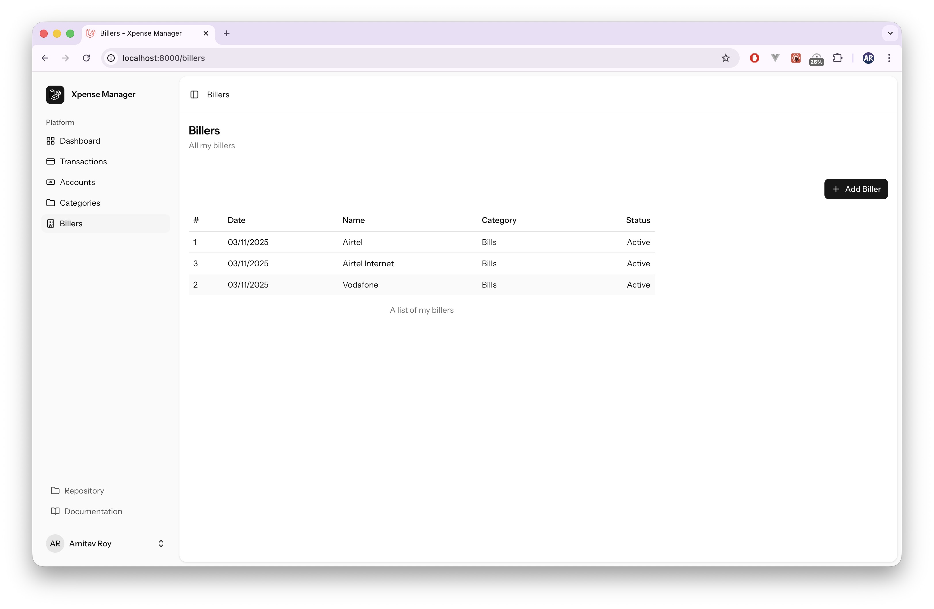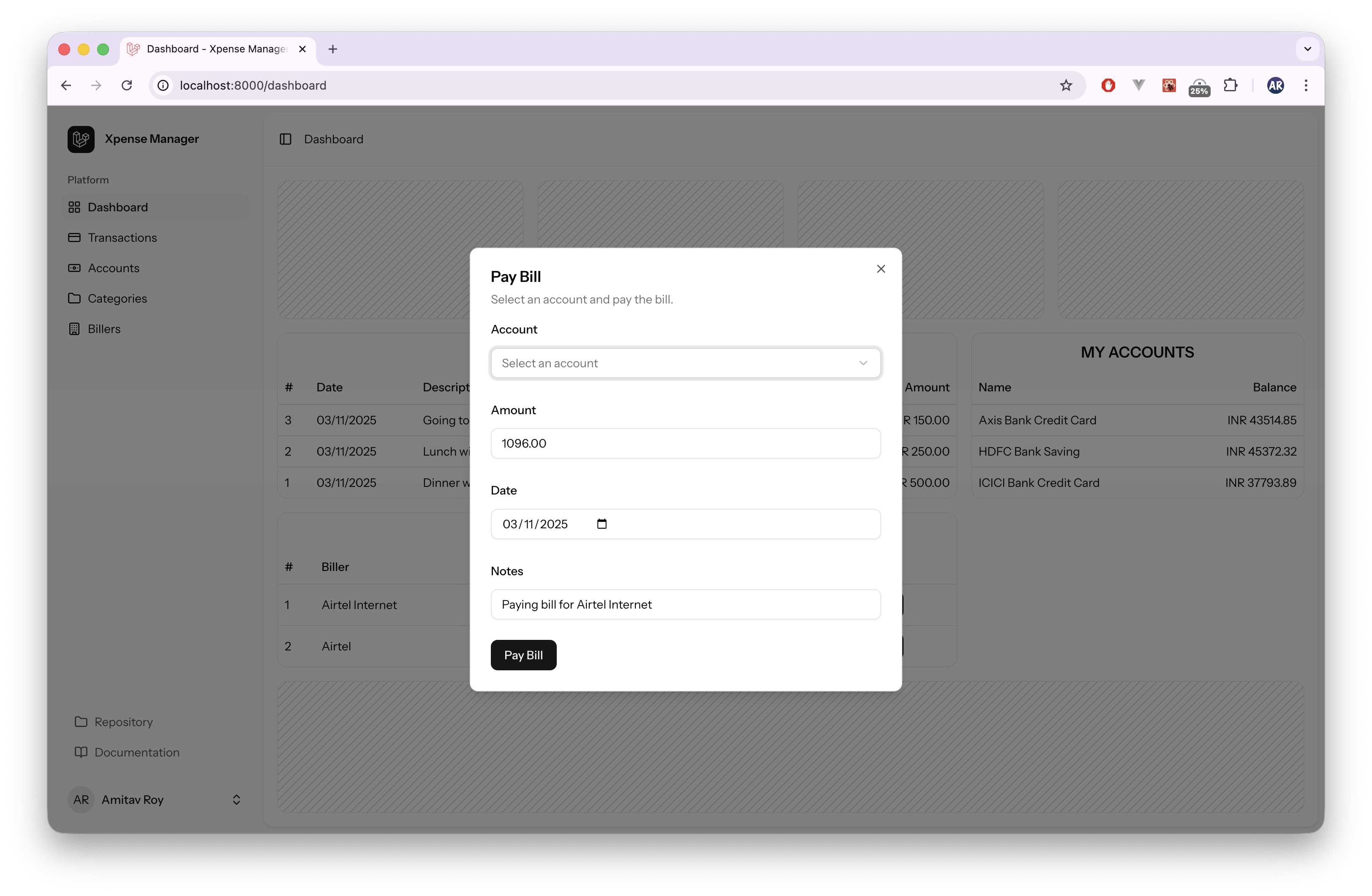 Users will be able to add Billers and their Bills. Based on that, Bills will be available on Dashboard for payment. When a Bill is paid, it will also get added to the Expenses with correct category.