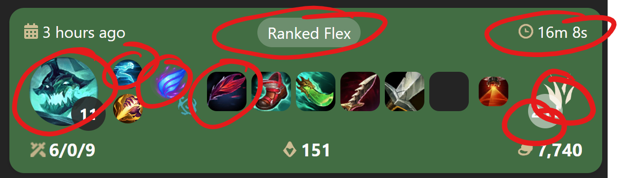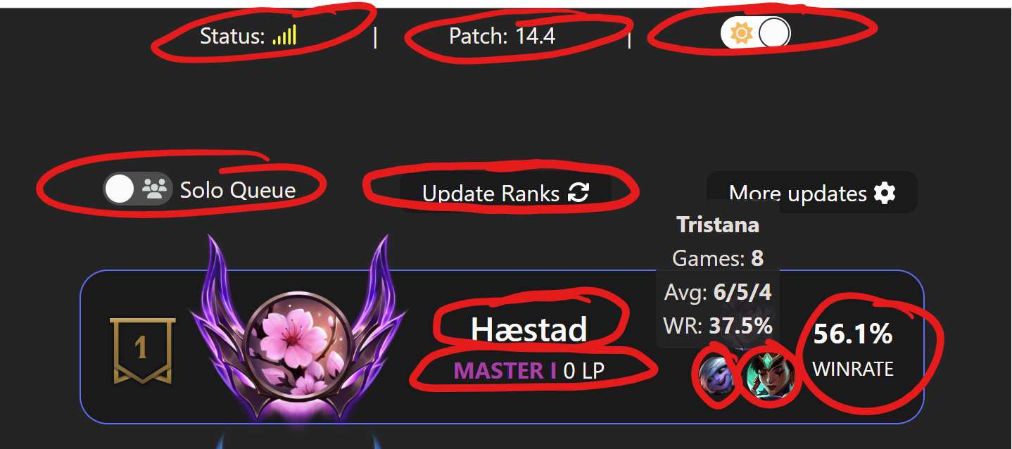 For displaying certain parts of the information I am sending from the backend, I chose to use tooltips from React Bootstrap. I am styling them on my own but relying on their already exisiting component and logic for displaying it. The information I am using the tooltips for is things like winrate, mastery points, kda's, amount of games, last seasons rank and other tooltip stuff. I have provided some images of how this looks for the user. Everything marked in red is hoverable.