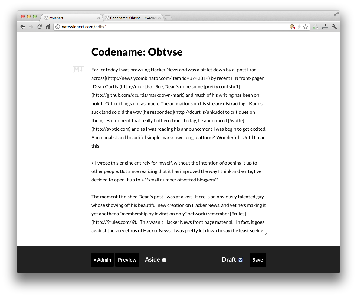 Codename: Obtvse Clean, simple blog. Inspired by Svbtle. Demo http://electric-fog-7674.herokuapp.com/admin Username: username Password: password TODO Make preview button work Pagination SCREENSHOTS