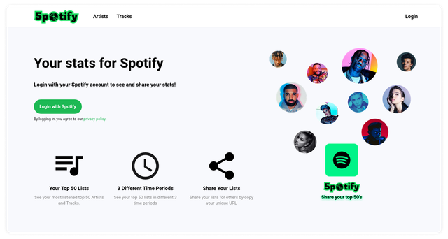 I built this project because similar projects do not have sharing feature. In those websites if you want to share your top 50's, you need to take screenshot or something. Then I decided to create sharable one by unique url with everyone. To create your lists you have to go spotify50.com and login with your Spotify account then your top 50 artists and tracks lists will be created and you can share that url with others.