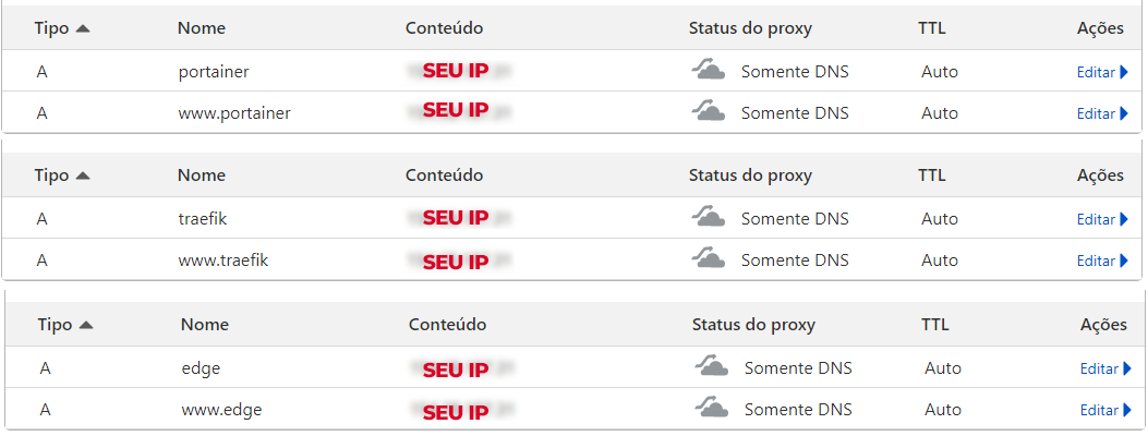 Você deve criar 6 subdominios do tipo 'A' na Cloudflare *Status do Proxy deve esta desligado