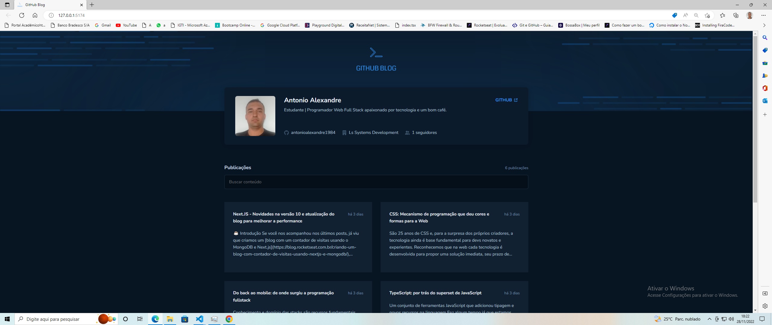 - Esse blog foi um projeto desenvolvido durante um desafio do Ignite da Rocketseat! A ideia era desenvolver do 0 uma aplicação. Neste projeto desenvolvemos uma aplicação onde utilizamos o consumo de uma API do github por clientes HTTP atraves de um blog pessoal.