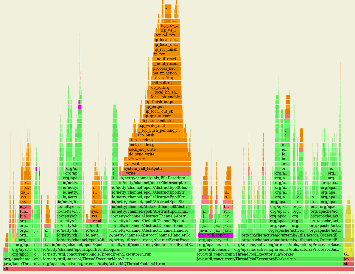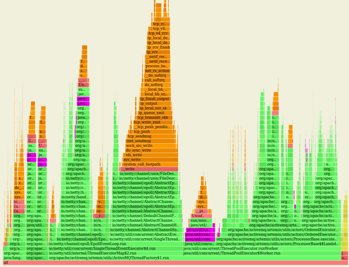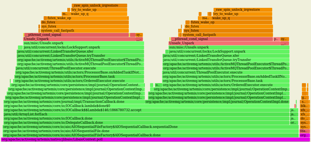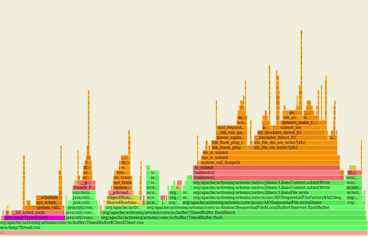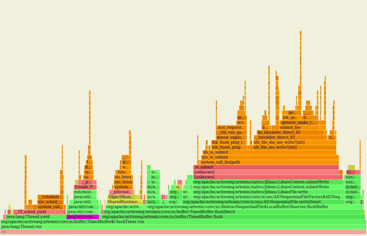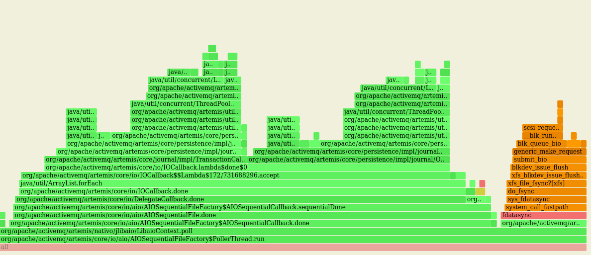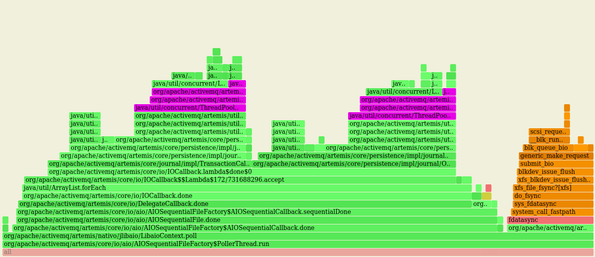 Differently from my expectation isn't the fdatasync that's backpressuring the incoming I/O requests, because a very fast disk can be quite fast to sync data on disks, but ThreadPoolExecutor::execute (in violet, below) due to the slow offer on LBQ: