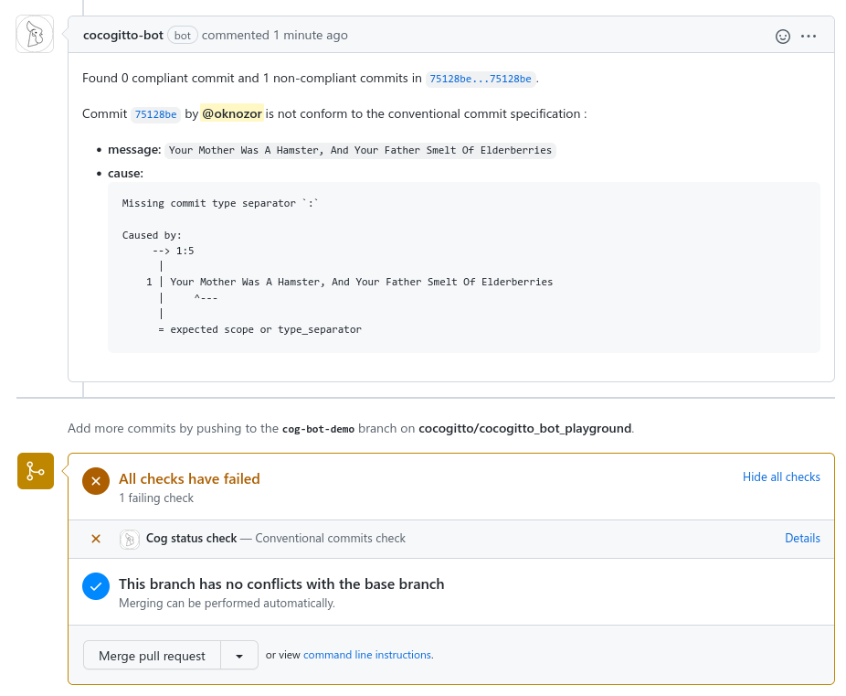 This bot uses cocogitto to perform status checks on your pull-requests and ensure every commit match the specification.