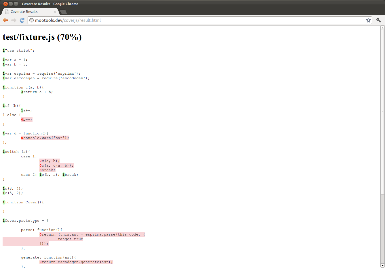 coverjs --output cov/ file.js test/*The instrumented code should be executed to count the number of calls for each statement.