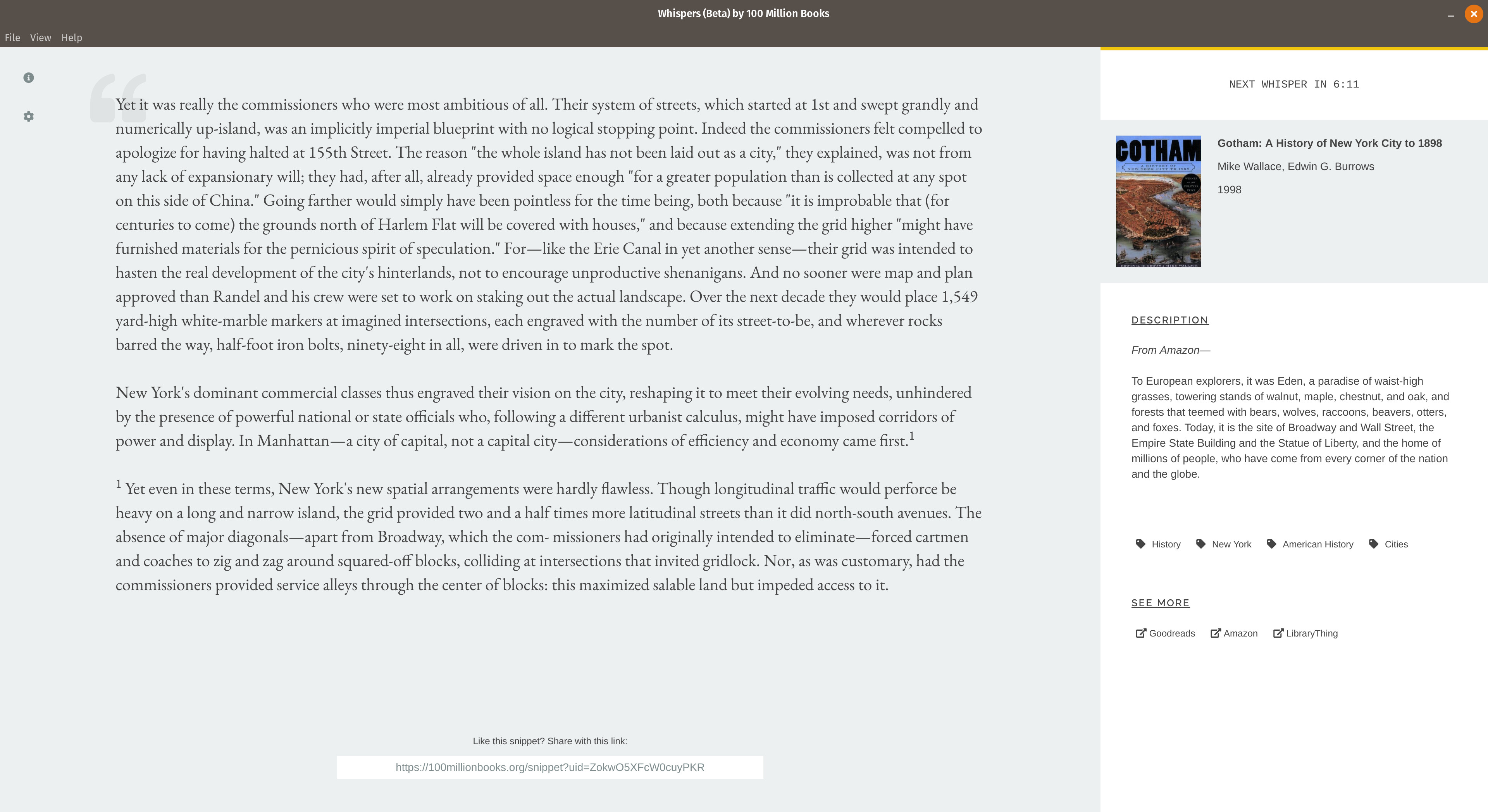 Whispers is a desktop client for the 100 Million Books service. It offers discreet notifications of meaningful ideas from random books throughout the day. You'll probably miss most of them, which is intended (the goal is to blend in with your work, not distract you from it), but the ones you do notice may open your mind to ideas & inspiration you wouldn't have seen anywhere else.
