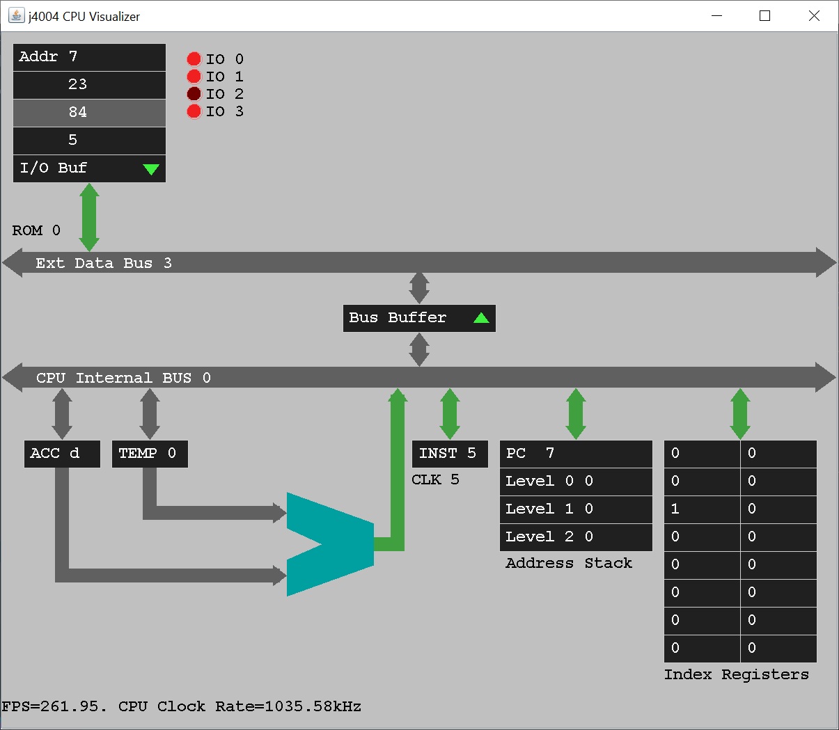 An Intel 4004 CPU emulator This was a fun little project blending two of my skills, hardware and software. I used to be an ASIC engineer (could you have guessed from my username)? I thought it would be fun to write a near cycle-accurate model of the venerable Intel 4004 microprocessor; the first commercially available microprocessor from Intel. This project is written in Kotlin (I know the project is titled "J"4004), with an optional graphics front-end. The graphics allowed me to visualize the processor in action. I modeled the UI to look like the block diagram you can find on the internet. I started this project in Go, but I found the performance with the GUI/etc was a little flaky, so I ported it all over to Kotlin.