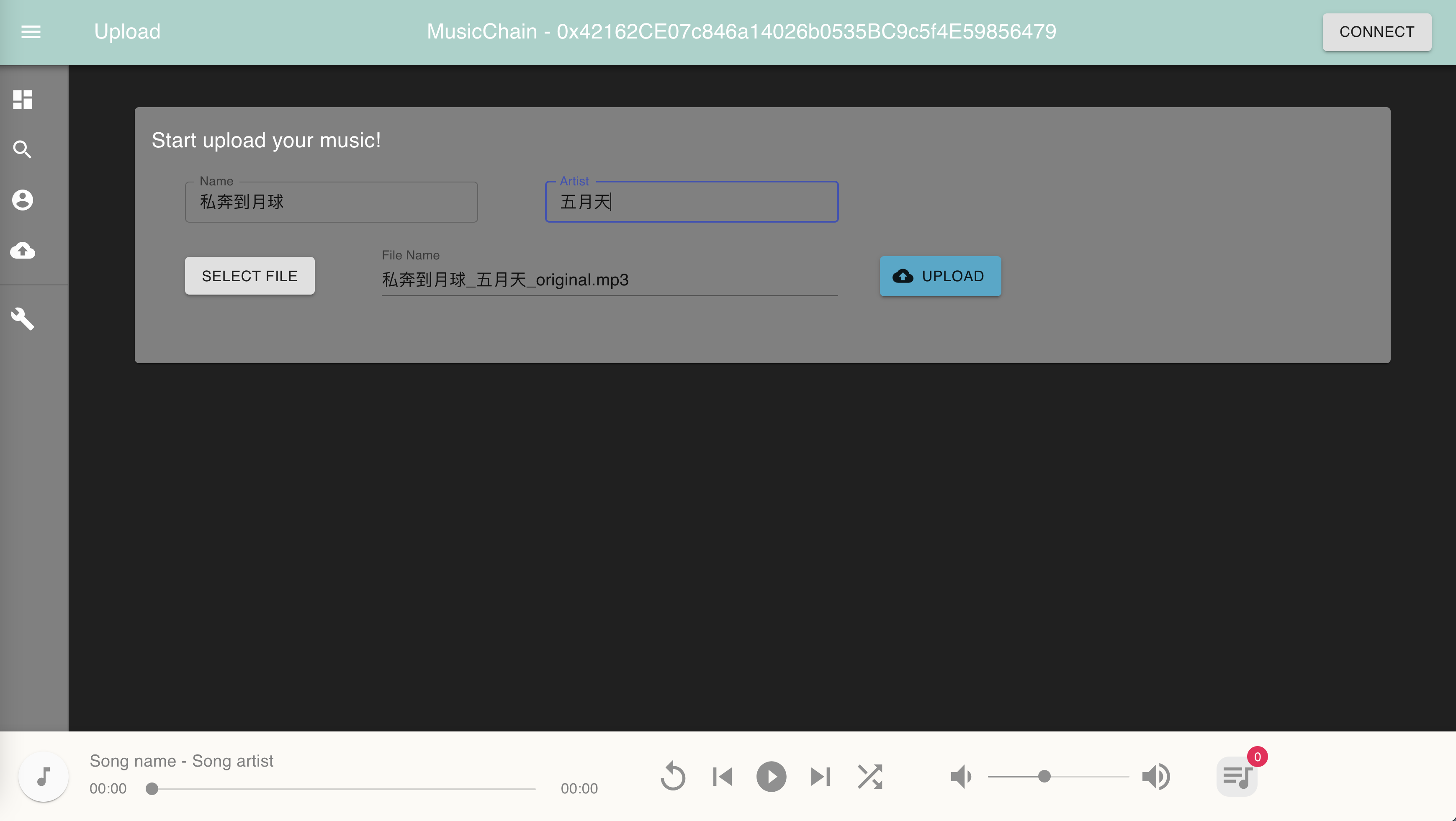 In this page, user can upload their music on the blockchain. The user is required to give name, artist, and the to upload audio file. We will do some check function before the upload is actually done.