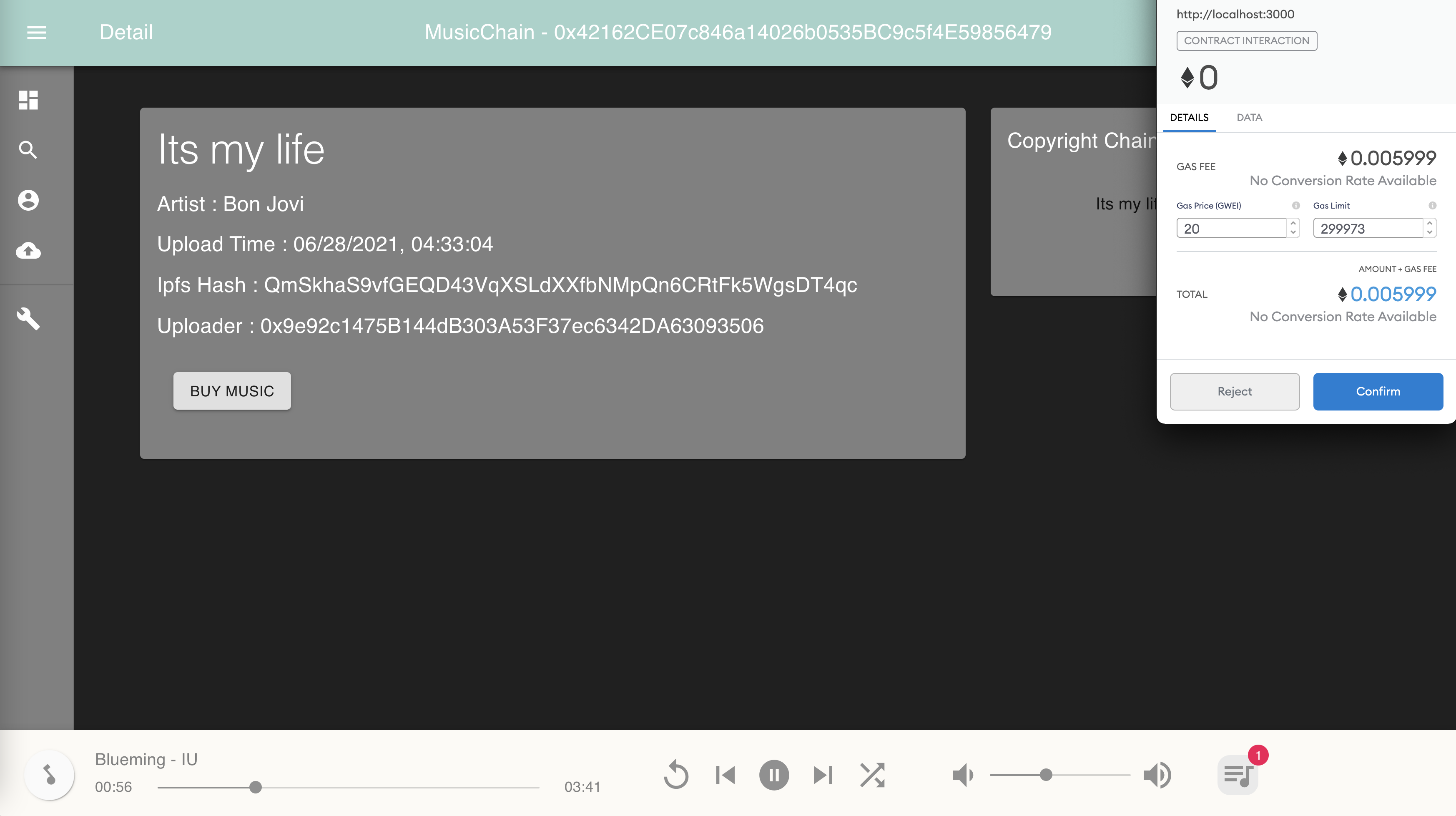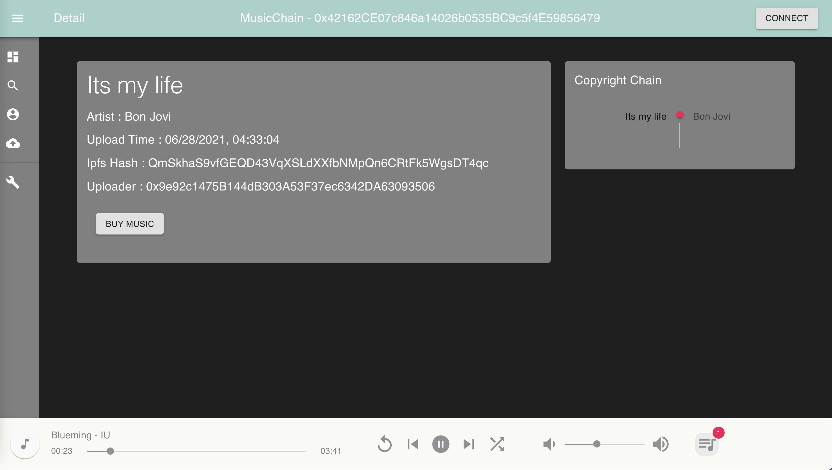 If the user had not bought this music, they can click the BUY MUSIC button to fire a transaction on the blockchain.