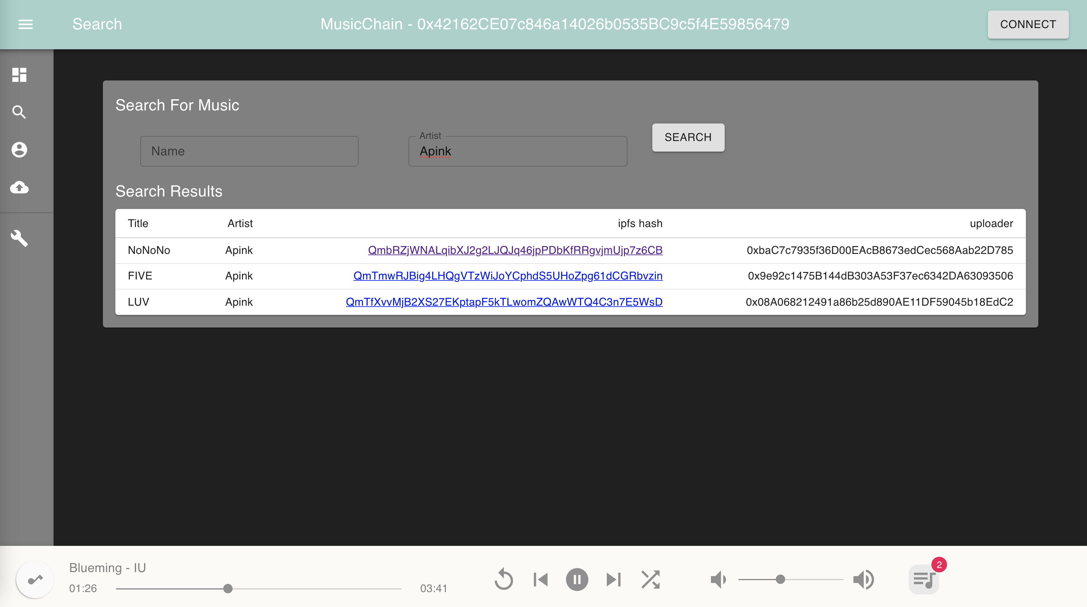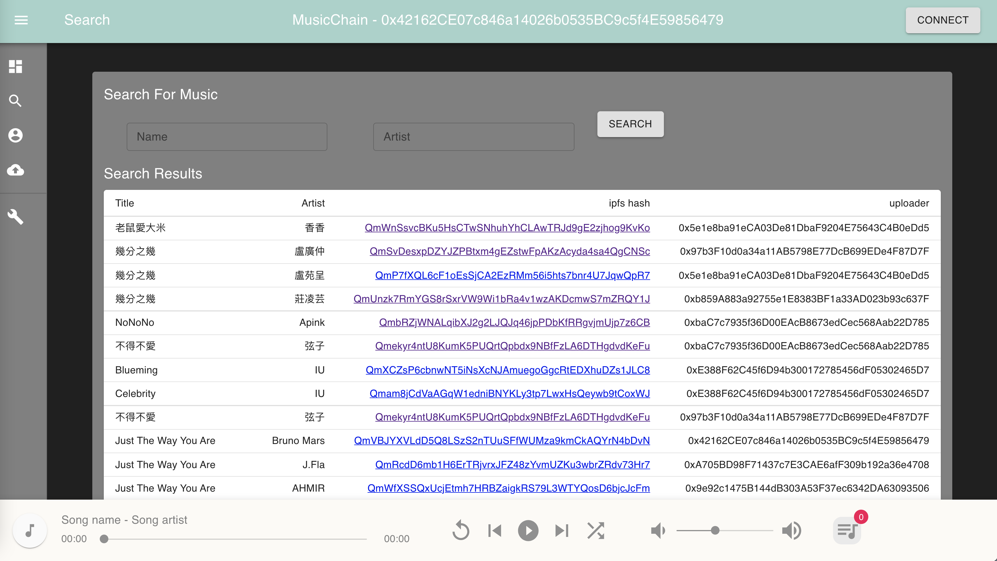 We implement a simple search function to find relevant music based on some keywords. If the name field and the artist field are both left unfilled, it will show all musics on the blockchain.