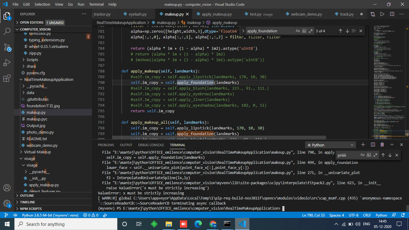 Im getting x must be strictly increasing in case of applying foundations and getting error in eye shadow such that the function univariate interpolate has less lx and more ly so numpy mismatch is there.scree shot attached