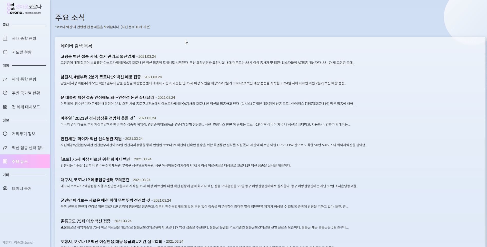 });네이버 뉴스 API와 다음 검색 API를 활용하여 '코로나 백신'관련 문서를 보여줍니다.