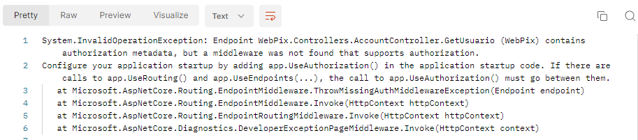 Ola Balta, tudo bem por ai?? Bom, acompanhando seu curso ([Fundamentos do ASP.NET 6 (100%) e tentando trazer para minha necessidade, encontrei um contra tempo em adicionar a Regra para autorizar o Role em Usuario. Ao aplicar o [Authorize] o Get passa a dar o erro: Segue abaixo a seguencia do codigo Classe AccountController namespace WebPix.Controllers /// Introdução: https://balta.io/player/assistir/8407be55-4137-48ae-baf5-470eef47a297/38598d9f-1adb-4638-8a4b-9c77ca3b9bc4 /// }` `using System.Security.Claims; namespace WebPix.Services /// Introdução: https://balta.io/player/assistir/8407be55-4137-48ae-baf5-470eef47a297/85412406-29b3-4592-a631-e76c2162dad8 /// /// /// public string GenerateToken(Usuario user) { var tokenHandler = new JwtSecurityTokenHandler(); var key = Encoding.ASCII.GetBytes(Configuration.JwtKey); }` `using System.Text; var builder = WebApplication.CreateBuilder(args); /// /// Introdução: https://balta.io/player/assistir/8407be55-4137-48ae-baf5-470eef47a297/36362ee4-42ae-4950-837a-b9f9ffa249e8 /// var key = Encoding.ASCII.GetBytes(Configuration.JwtKey); builder builder builder builder ///Explicação do Tempo de Uso do Token var app = builder.Build(); app.MapControllers(); app.Run();` Poderia me dar uma "Luz" donde estou errando?? Marcelinho |