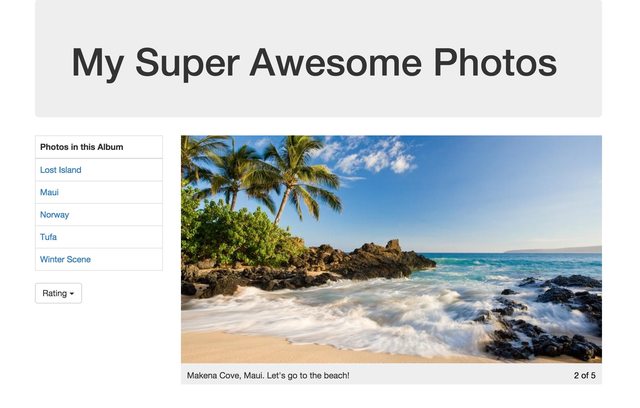 AppHeader(just HTML with Bootstrap)AlbumInfo(table that holds list)PhotoListHeader(displays a heading for the album)PhotoTitle(displays a clickable photo title)