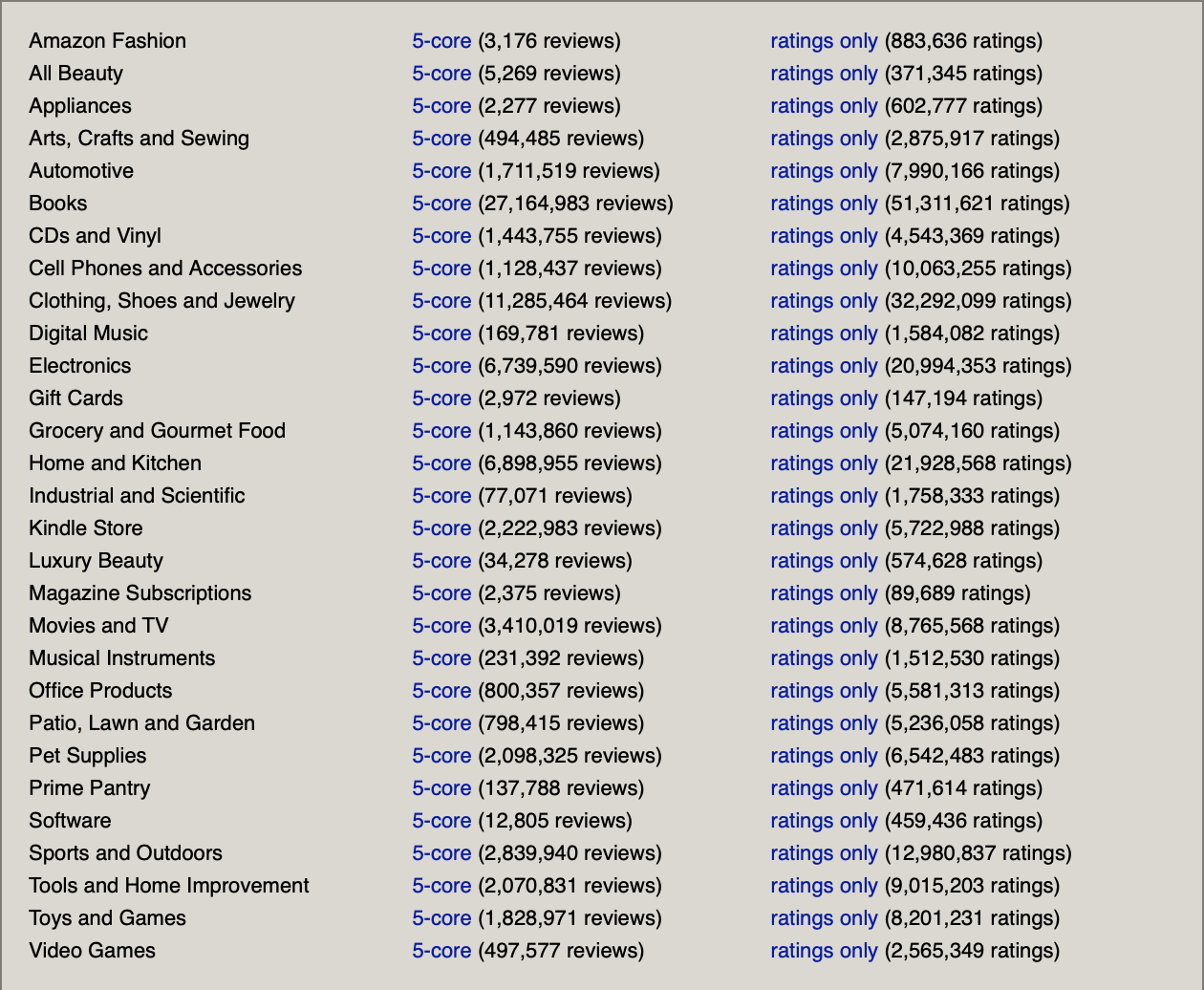 For development/testing we used the 5-core (14.3gb) - subset of the data in which all users and items have at least 5 reviews (75.26 million total reviews across all datasets).