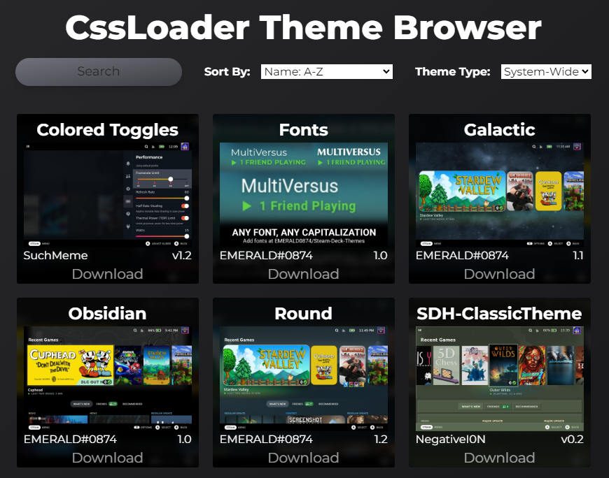 CssLoader is a plugin for the Steam Deck Homebrew (Decky) plugin loader, it enables users to design or install custom CSS themes that they can apply to the Steam Deck UI. It has a react-based theme browser that can be accessed from within the plugin, that pulls data from a database and has 1-click installs of themes.