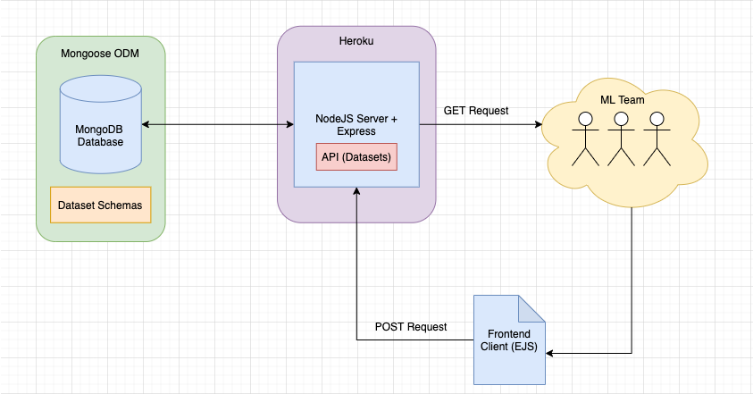All the datasets (and maybe eventually things like model architectures) are stored in a MongoDB database, using the Mongoose ODM for document validation between the database and API.