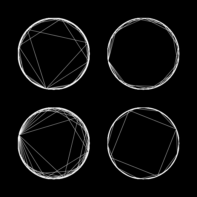 This project is an exploration of generating a circle in fifty different ways. You can read about the motivation for the project here. This was inspired by Manohar Vanga's very similar project, but the code is all my own.