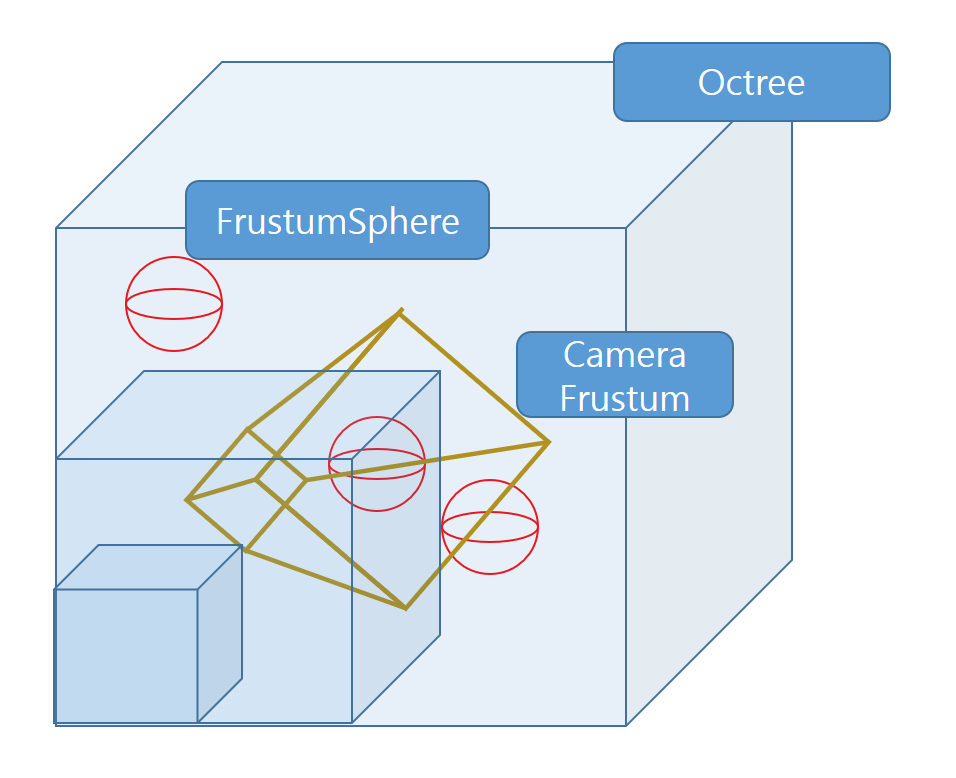 If frustum is in octreeElem, recursively check children octreeElems again. If frustum is overlap with octreeElem, test all sphere in octreeElem & recursively check children octreeElems 1 again. If frustum is not overlap, except octreeElem.