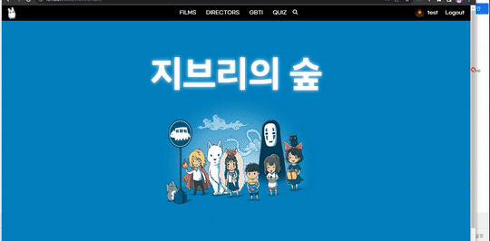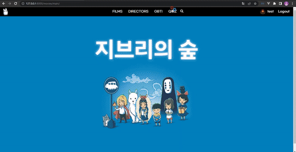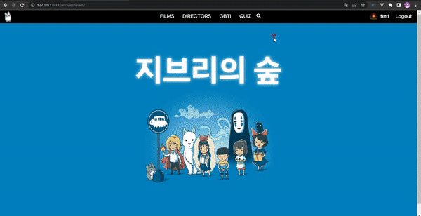 1. FILMS 페이지 2. 영화 상세 페이지 3. DIRECTORS 페이지 4. 영화 감독 상세 페이지 5. GBTI 페이지(설문-결과) 6. QUIZ 페이지(풀이-결과) 7. 지브리 영화 검색 기능 8. 영화 리뷰 생성 기능 9. 영화 리뷰 삭제 기능 10. 영화 리뷰 수정 기능 11. 영화 리뷰 좋아요 기능 12. 영화 리뷰 삭제 기능 |