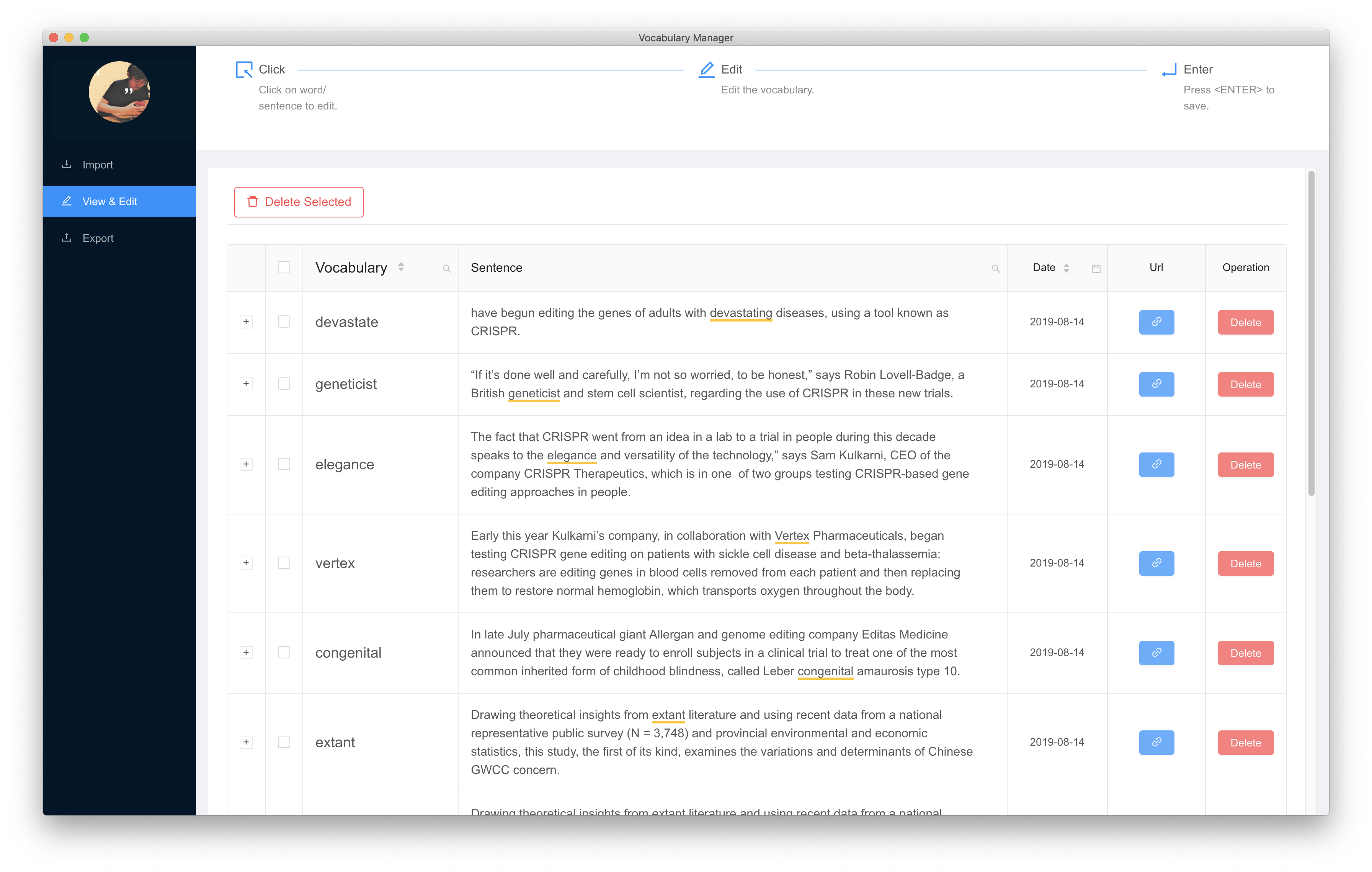 Vocabulary Manager is a cross-platform (Mac/Win/Linux) desktop application that manages vocabularies collected by vocabulary-picker. It also support export records to Anki for more flexible management.