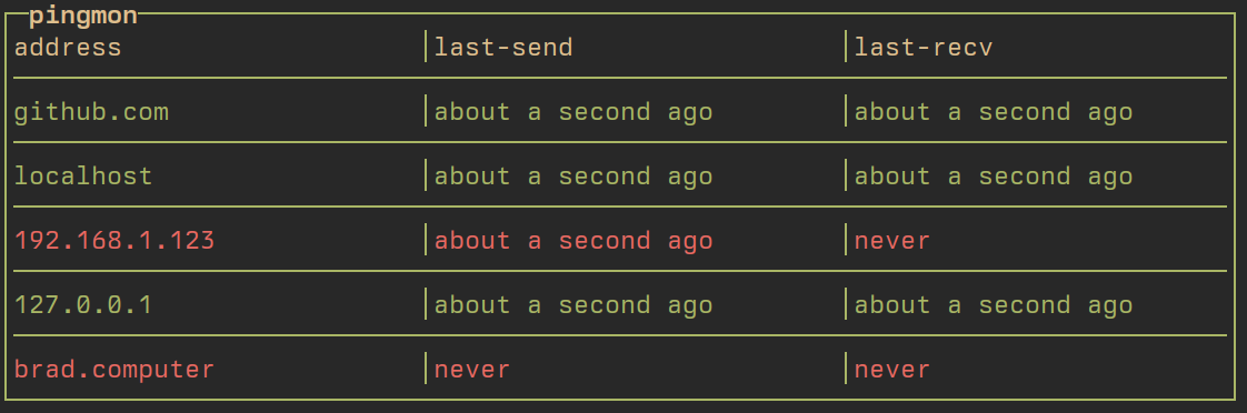 pingmon A Ping Monitor Install go install github.com/brosenlof/pingmon@latest Use pingmon github.com localhost 192.168.1.123 127.0.0.1 brad.computer pingmon $(cat address-list.txt)